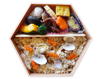 「長洲きゃあめし弁当」は、有明海産のあさりで作った「きゃあめし」をメインに、長洲町の季節の材料をふんだんに使ったおかずがぎっしりの懐かしい郷土弁当です。 ぜひ、長洲町のめぐみをご賞味ください。